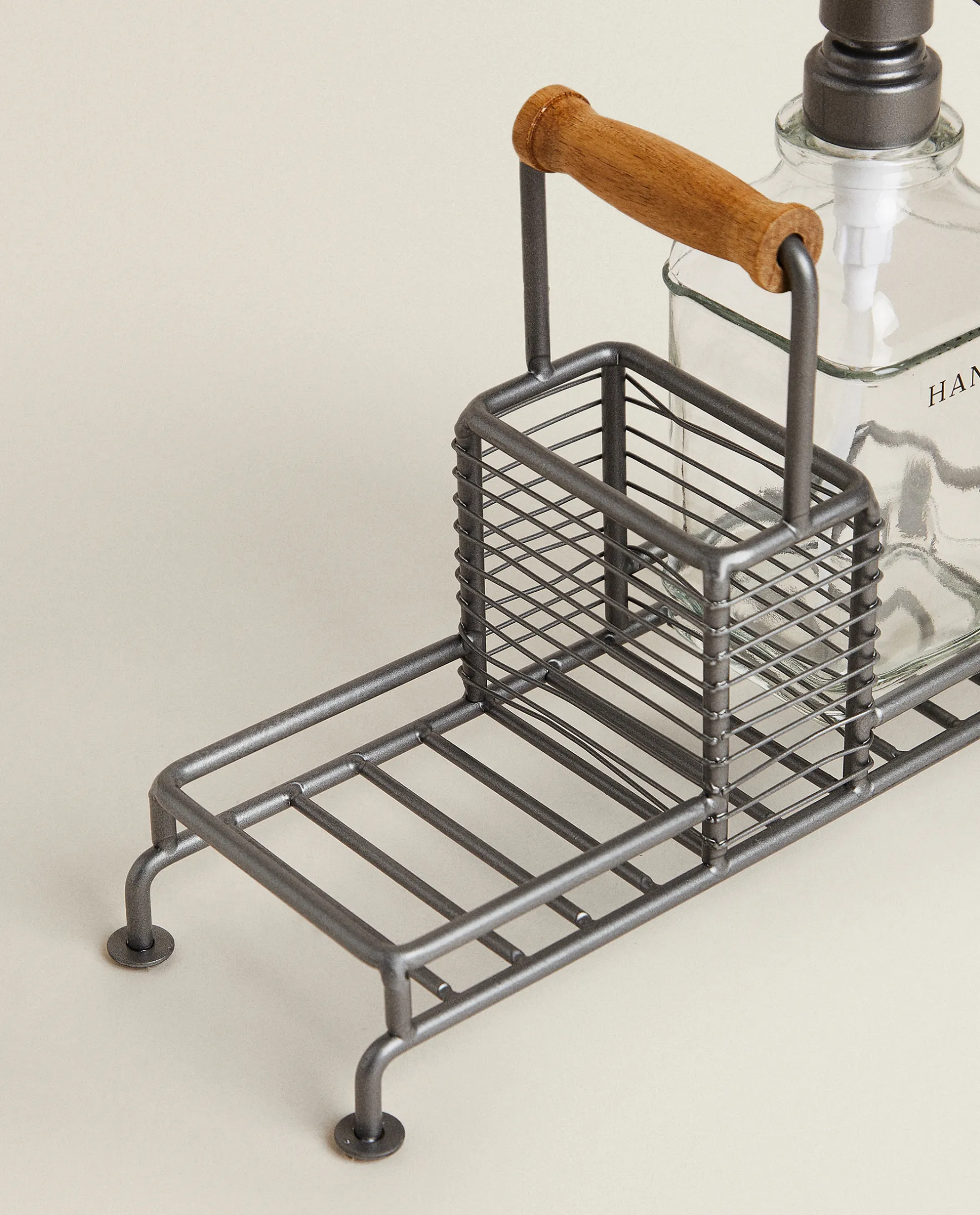 Metal Stand With A Wooden Handle And Two Dispensers, One For Hand Soap And The Other For Dish Soap. The Tray Also Includes A Space For Storing A Sponge Or Scourer. Capacity Of Each Dispenser: 9.81 Oz