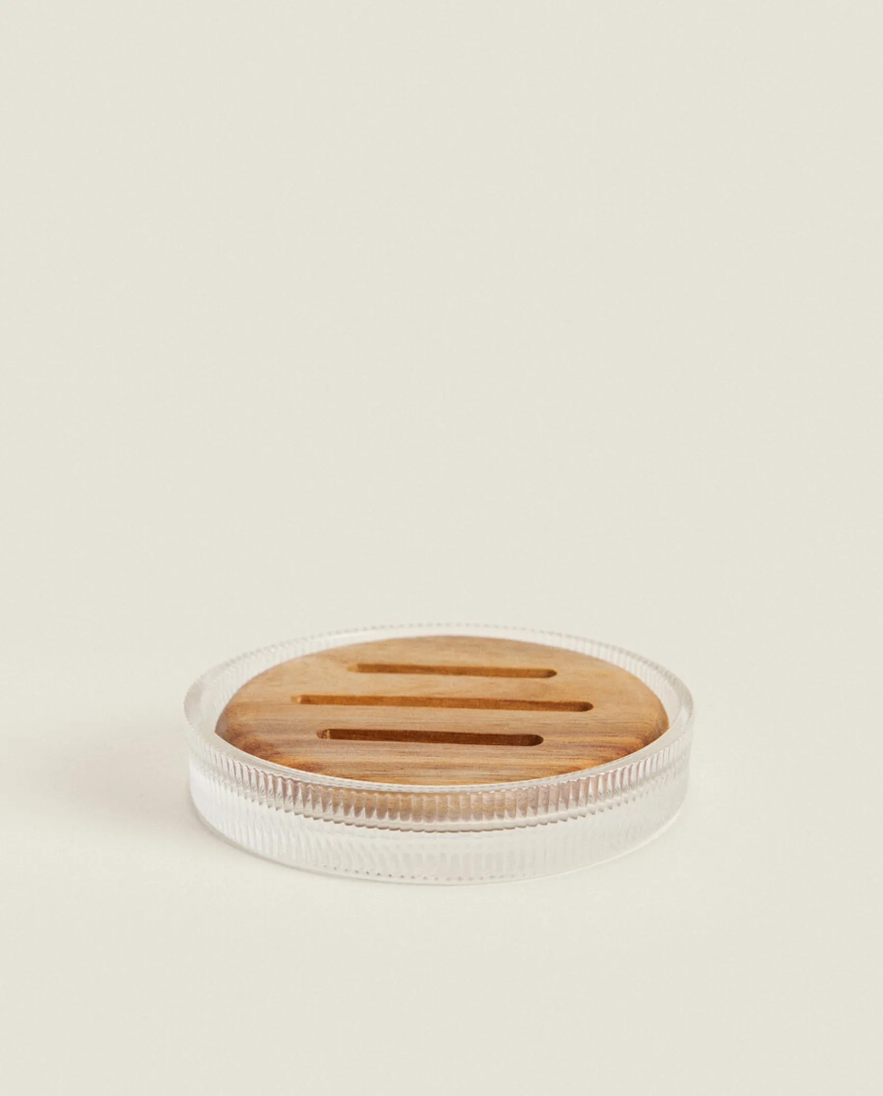 Round Glass And Wood Soap Dish With A Raised Stripe Design.