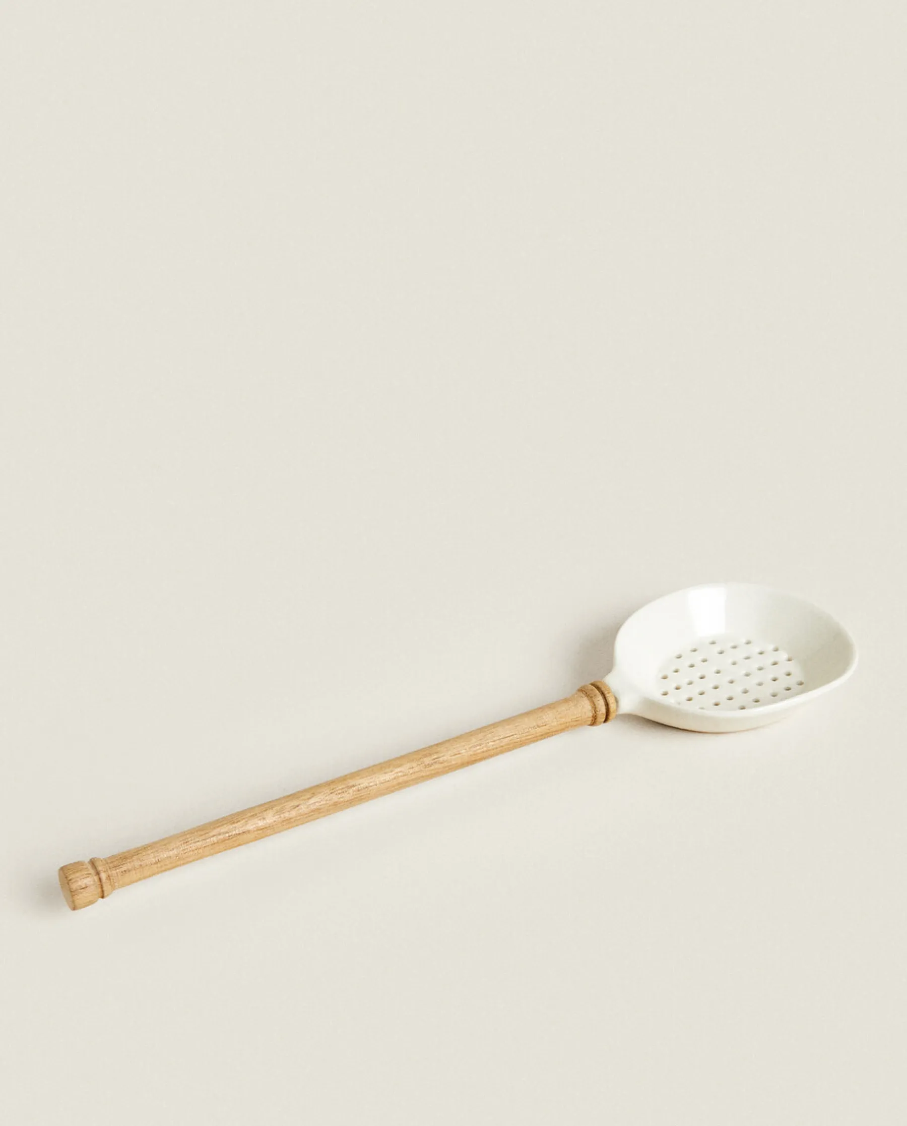 Ceramic Slotted Spoon With An Acacia Wood Handle.