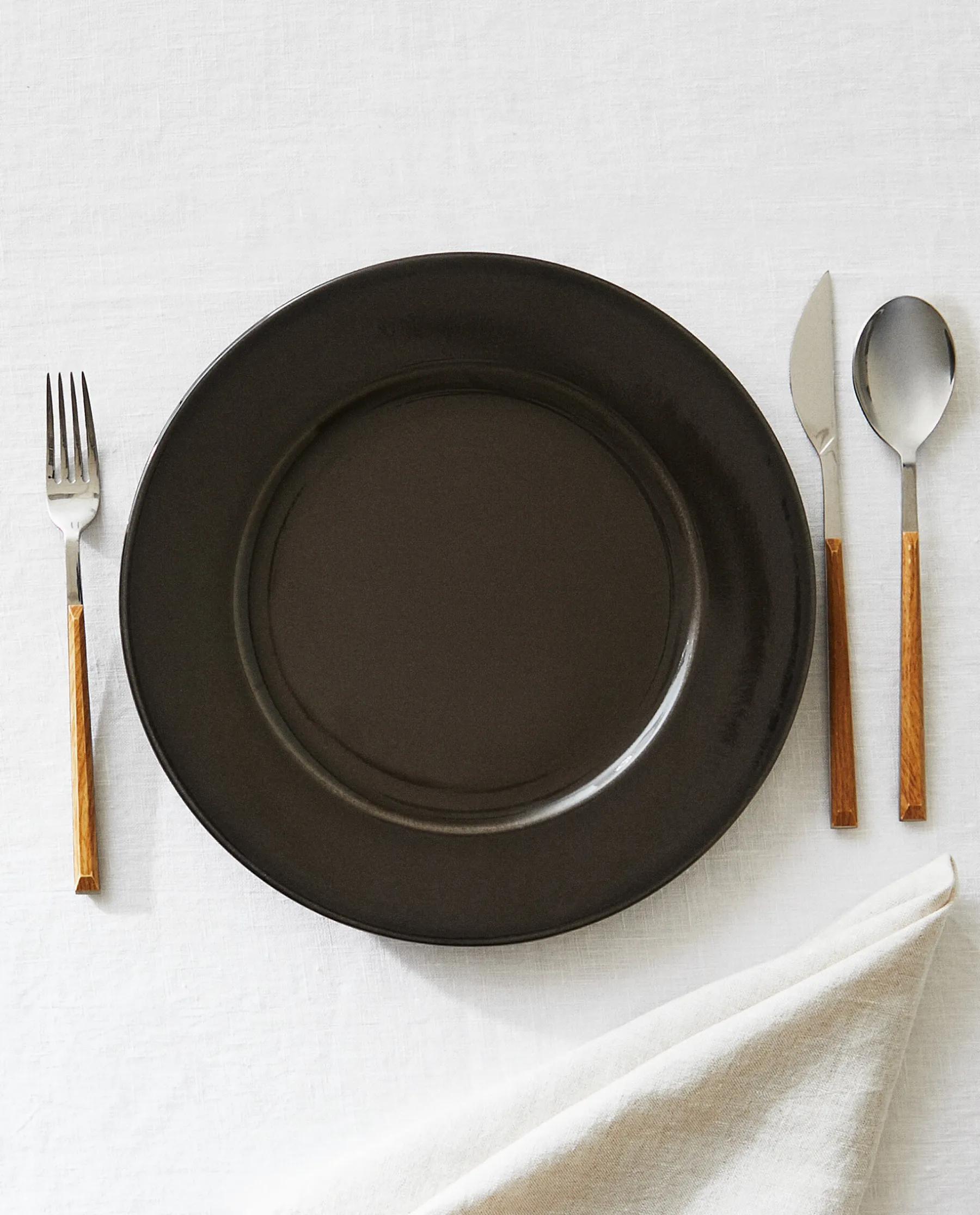 Shiny Black Enameled Dinner Plate With A Subtle Grayish Line Around The Edge.