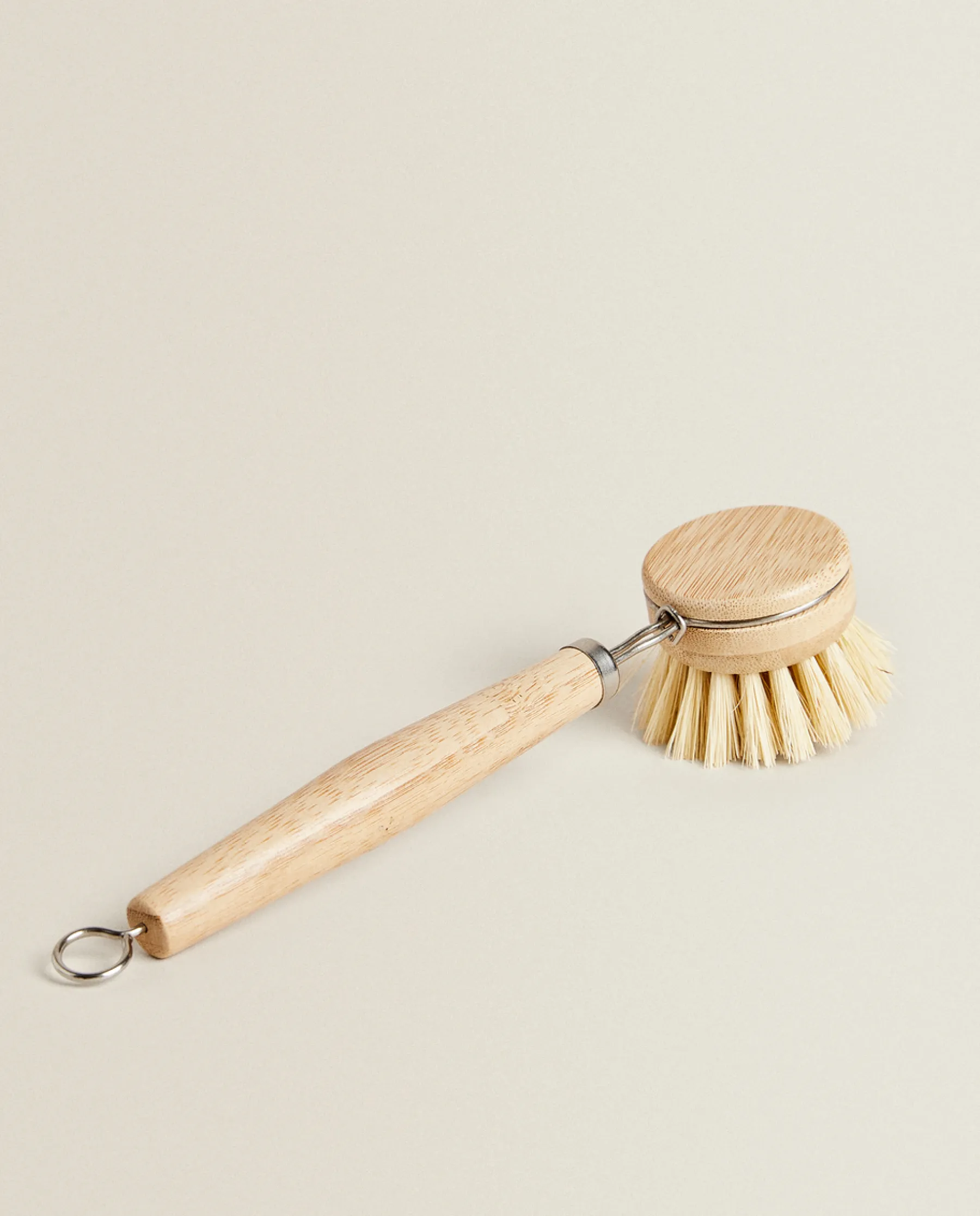 Tableware Brush With A Handle And Base Made Of Bamboo Wood And Natural Fibers. Featuring A Stainless Steel Ring For Hanging In Any Part Of The Kitchen.